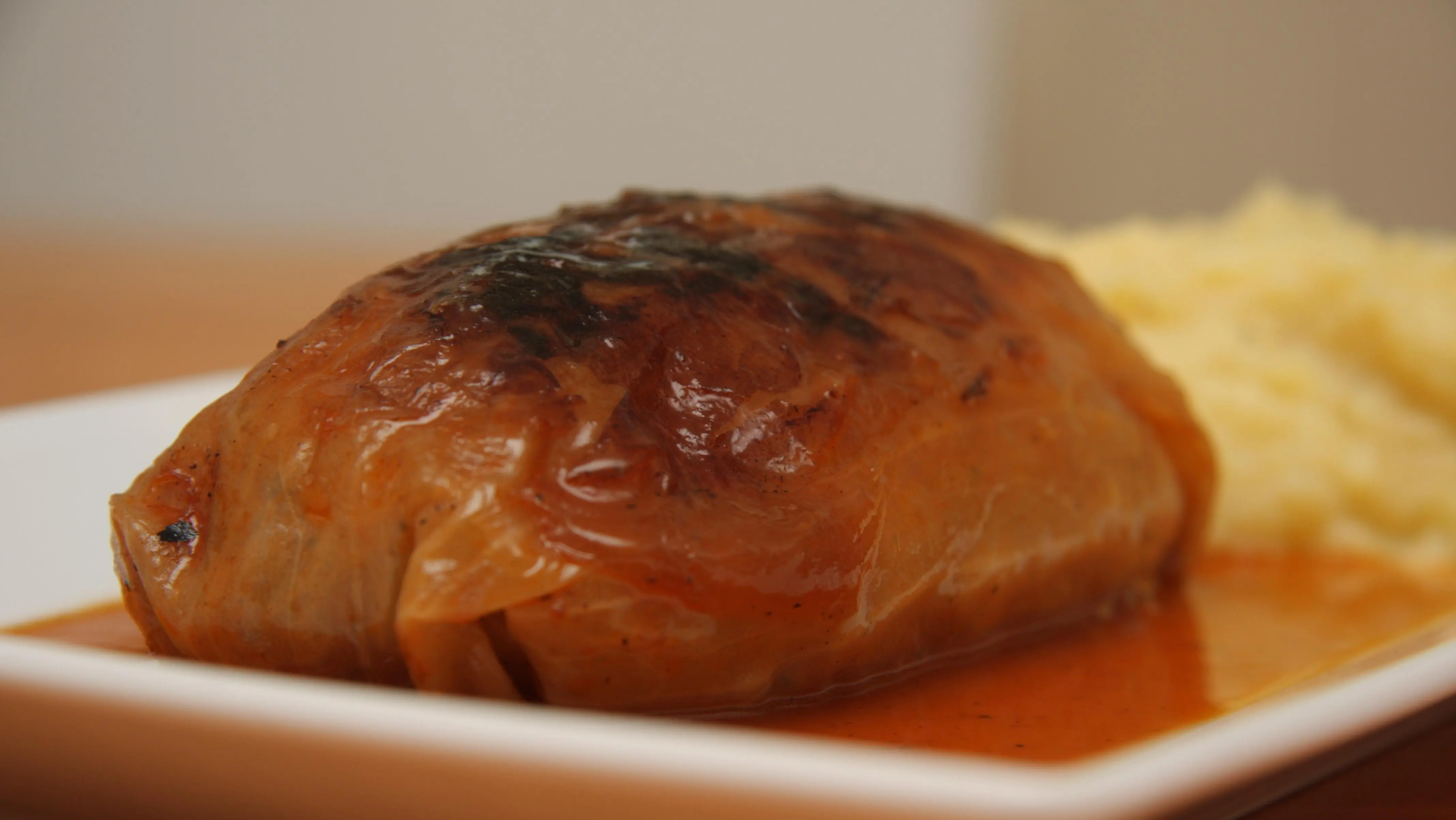 Dann die Weißkohlrouladen herausnehmen. Die Soße aufkochen, mit Sahne aufgießen, etwas einkochen lassen und mit Soßenbinder binden. Als Letztes die Soße mit Gewürzen abschmecken und auf einem Teller servieren.